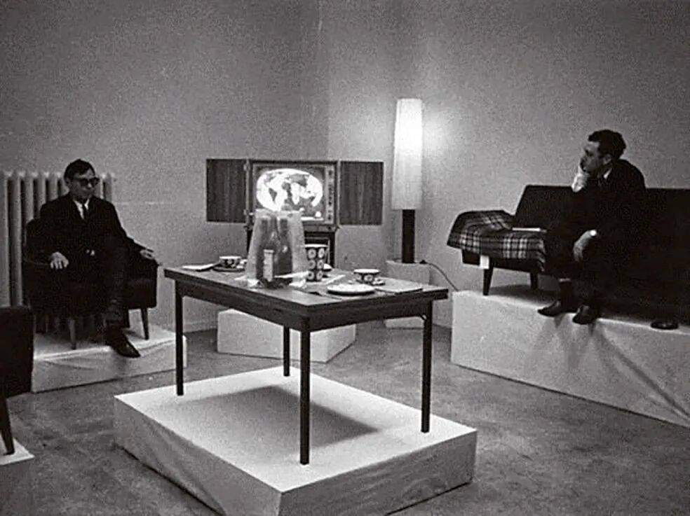 图4 [德] 格哈德·里希特 派对 150×182厘米 1963 德哈德·里希特档案馆藏此中最具代表性的是里希特展出的绘画《派对》(Party,1963,图4) 。该做品取自一本上的照片,画中的人物是一位正在西德红极一时的电视明星维克·托里亚尼(Vico Torriani),他正在喝着潘趣酒(punch)〔12〕的同时,嘴里还流淌出红色液体(介于酒精取血液的暧昧指涉),这也取身畔女性的缝合伤疤构成一种视觉修辞:一方面,缝合线正在此处既指代二和后的集体身体回忆,也暗示冷和分治下“两个”的报酬割裂形态。里希特正在此调用卢齐奥·丰塔纳(Lucio Fontana)的“空间概念”并非纯真的形式自创,里希特则用缝合线封锁伤口,暗示修复下的永世性创伤。另一方面,画中明星的欢宴场景取女性伤疤的并置,也揭露了西德“经济奇不雅”的深层矛盾:电视前言塑制的消费从义狂欢(托里亚尼做为一个公共文化符号)取和平创伤的不成见(缝合线提醒的被压制回忆)构成明显对照。此外,做为做品中独一刺目标颜色,液体的红色取缝合线的红色一道形成了相关颜色的学:红色既是社会从义阵营的色彩,呼应东德中的红旗和,同时也为从文娱明星口中流出的汁液(酒/血),指向认识形态渗入的日常化;缝合线的“修补”姿势则进一步了西德社会试图通过经济繁荣缝合汗青裂痕的徒劳。这种双沉编码恰是本钱从义现实从义的焦点手法:借由对现实的复制,揭开了笼盖其上的那层懦弱伪饰。回到展览本身。正如里希特等人正在旧事稿中所强调的,此次展览并不具有贸易性质,而是意正在阐扬一种示范效应。由于他们正在宣传本身的同时,并没无为本人的做品寻找潜正在买家。现实上,这个短促的展览没有给留下深刻的印象,除参加的不雅众外,仅有几家本地略做报道。虽然如斯,这个青年集体不曾因而泄气。1963年10月,里希特取卢埃格又配合筹谋了一场更具惊动效应的步履。取此同时,本钱从义现实从义者的艺术活动也自凯撒大街31A起始,并延续至1966年,先后举办了四次展览,然综不雅这一系列的全貌,其全体气概终不决型。不用说,他们的实践恰好表现为一种以尝试为常态的持续性摸索。正在一个安插得有些简陋但稍显温暖的客堂里,摆放着多个展现台,展现了各式家居用品;有两位身着西拆、打着领带的青年人,各自选择了一张扶手椅和一张长沙发,老神正在正在地坐正在其上:前者跷着腿,百无聊赖地凝视着茶几上看似随便摆放的酒水、等物件;后者斜目看着一台电视,这就是卢埃格和里希特正在“取波普共处”展览中筹谋的一件行为做品《活体雕塑》(Living Sculpture,图5) ,事务发生的地址不是正在一处私家室第而是正在一间出售家居的商铺。这件做品凭仗其奇特的表示形式,吸引了不少参不雅者的留意。