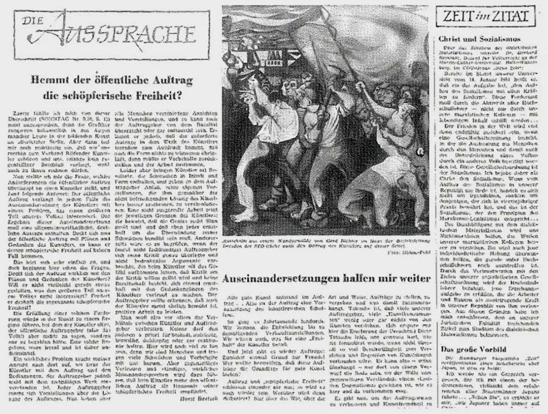 激浪音乐节明显深刻影响了西德的前卫艺术,罗伯特·沃茨(Robert Watts)曾坦言激浪正在其时的影响:“激浪就像是一张网,网罗了全世界,也网罗了大家马,有画家、雕塑家、音乐家、做家、建建师等。”〔32〕激浪派“糊口即艺术”的也成为本钱从义现实从义者创做的根本。当里希特回忆起这场勾当时,他说道:“这一切都很是愤世嫉俗,具有性。这对我们来说是一个信号,我们变得愤世嫉俗、傲慢自卑,告诉本人艺术是‘牛的’(bull),塞尚是笨笨的……我要画一张照片!激浪派是催化剂。”〔33〕这也就注释了《取波普共处》展览中会见到博伊于斯的服饰和其标记性的油脂,这亦是一次致敬。而正在这场音乐节竣事后,里希特、波尔克和卢埃格保留了马修纳斯《宣言》的副本,并颁布发表“断根世界上资产阶层的病态、‘智力’的、专业的以及贸易的文化”这句话为他们的座左铭。此后不久,他们便向凯撒大街31A的一间空置的肉店提交了租用申请,从而分开了学校的空间。借由示范展的举办,里希特等人获得一个前去加入艺术家协会年度展览(Deutsche Künstlerbund)的机遇,就是正在这个展览上,里希特等人吸引到了同为莱茵河区的年轻画商勒内·布洛克(René Block)的留意。1964年9月,布洛克开办了本人的画廊,其首展即是“新达达、波普、解构拼贴、本钱从义现实从义”(Neodada, Pop, Décollage, Kapitalistischer Realismus)。一路展出的除里希特、波尔克、卢埃格正在内的杜塞尔多夫群体外,还有沃尔夫·沃斯特尔(Wolf Vostell)、卡彼·布莱梅(K。 P。 Brehmer)、K。 H。 赫迪克(K。 H。 Hoedicke)等一批年轻的西德前卫艺术家们。〔34〕布洛克正在展览中借用了“本钱从义现实从义”,把此中的每个单词都做大写处置,试图将之做为一种更具国际性的品牌营销策略,好像美国波普艺术般推向全球。由于正在布洛克看来,本钱从义现实从义能够表现出工具德期间的社会时局:“我最早用‘本钱从义现实从义’这个名字做的展览(1964年)针对的是其时的文化政策。不要忘了阿谁时候西德的和地舆,四周满是社会从义现实从义艺术。这个词反映并了工具两德的,一边许诺丰硕的物质糊口,另一边则强调带动和宣传。同时,这个词也能跟美国波普艺术相区别。”〔35〕这一做法正在其时招致了里希特的不悦,做为“本钱从义现实从义”的提出者,他并不单愿这个词被钉上标签,更不用说使其成为某一种认识形态的宣传东西。〔36〕由此可见,里希特对本钱从义现实从义有本人的看法取。比起布洛克精明且久远的打算,里希特没有对本钱从义现实从义有太多迷恋,如他所言,这个术语的提出只是一时兴起,“我们是正在玩火——正在寻找我们解构艺术何故走下去的途中”〔37〕。若是仅仅是时下的社会现象,布洛克取里希特并没有太多冲突,两者的不合正在于,布洛克正在“本钱从义现实从义”身上看到了一种可包拆且能推向国际市场的文化符号的潜力。但正在里希特看来,本钱从义现实从义起首是对现实的和反思,是正在特定汗青语境下的艺术步履,比起市场化,他更关心艺术本身的尝试性取性。然而,里希特正在一段期间测验考试过这些前卫艺术后,又为何取其连结了距离?他缘何反感艺术的市场化取化?其本身的艺术边界又正在何处?他又为何将本人称做一个矛盾的人?他为何而矛盾?这些问题大概要先回到里希特的东德期间去问询。1945年,和降,以东及其14个区被割让给了苏联,自此成立起了德意志国,俗称“东德”。东德除了奉行和打算经济外,文化层面也遭到苏联深刻影响。1947年11月,苏联文化官员亚历山大·戴姆希茨(Alexander Dymschitz)正在题为“苏联艺术取资产阶层艺术的关系”的中,盛赞苏联社会从义现实从义的优胜性,他认为立体从义、超现实从义、笼统从义等现代艺术使文化精英以外的人无解做品。当斯大林正在1934年将社会从义现实从义定为国度气概后,它就做为“人平易近的气概”帮帮确保社会从义正在苏联的胜利。戴姆茨基认为这一气概移植到地盘,同样能够帮帮从的和平易近族失败的废墟中培育出一个新的社会从义社会。〔38〕正在具体的文艺奉行中,次要表示正在三个方面:奉行消弭阶层认识的同质文化,从意从命于的极权从义,以及倡导、和乌托邦抱负的文化意味从义。〔39〕而彼时做为里希特的家乡,同时也是保守的文化核心之一,德累斯稽首当其冲地担任起了社会从义现实从义的实践和奉行。〔40〕1950年,其时有过一些绘画经验的里希特〔41〕报考了德累斯顿美术学院,但考官认为其做品过于资产阶层化而因而落榜。次年,为了合适学校的要求,里希特插手了一个国立艺术组织,进修画一些取斯大林相关的题材,这也最终使他成功入学。正在学院期间,里希特接管的美术锻炼严酷而保守。他一方面要系统进修社会从义的取理论根本,另一方面通过人体写生罗致灵感,深切理解构图道理,并普遍控制多种门户的手艺取前言使用。正在“绘画”班进修数年后,他选择进入壁画班。这一转向并非偶尔:和后东德社会遍及洋溢着因和平失利而导致的低迷,壁画因其弘大的公共性取叙事能力,被付与振奋、塑制集体认同的主要。更为环节的是,正在其时壁画被视做一种粉饰艺术,答应必然程度的形式摸索,这为里希特供给了罕见的创做裂缝——他得以正在某种程度上避开严酷的社会从义现实从义,明显地成